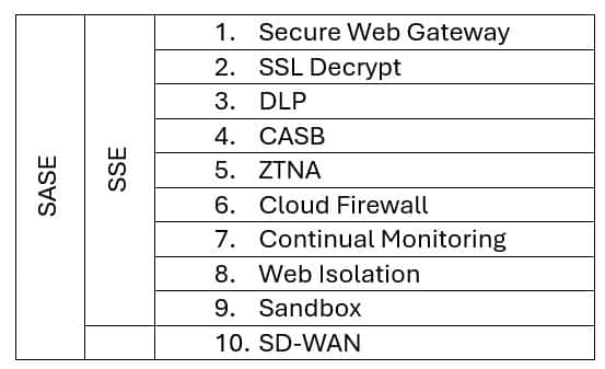 Para cumplir con el framework de SSE y SASE se debe contar con las siguientes soluciones de seguridad en el entorno corporativo.