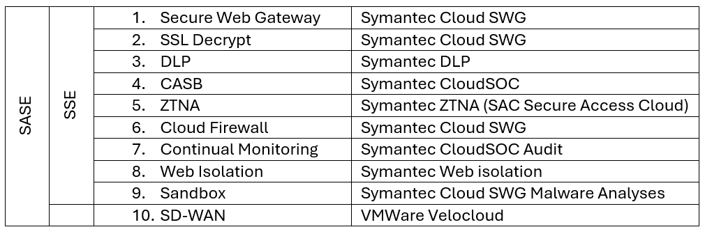 Existen diferentes fabricantes de Software y hardware para cada uno, se recomienda hacer un análisis de cada una de ellas para poder así escoger cual es la mejor para cada una de ellas también se debe analizar la capacidad de integrarse con otros para así cubrir todas las necesidades con el mínimo esfuerzo en la implementación y administración. Broadcom Software con la adquisición de las empresas Symantec y VMWare cubre el esquema completo de SSE con Productos Symantec y SASE con en conjunto con la Solución de VeloCloud de VMWare para SD-WAN. A continuación, los Servicios de SSE y SASE con el Software de Broadcom que cubre con cada uno de estos servicios.