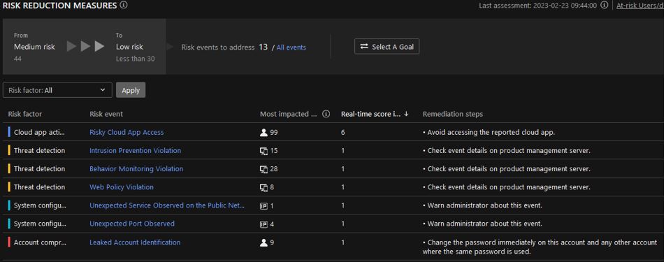 TrendMicro VisionOne en el módulo Operations Dashboard ahora incluye una forma de comprender y administrar mejor el riesgo cibernético. Con el widget de Medidas de reducción de riesgos, puede ver información sobre eventos de riesgo de alto impacto y pasos de remediación que debe completar para lograr objetivos específicos (bajar el Score de riesgo de la entidad entre otros). Panel de Riesgos: Detalle del Riesgo:
